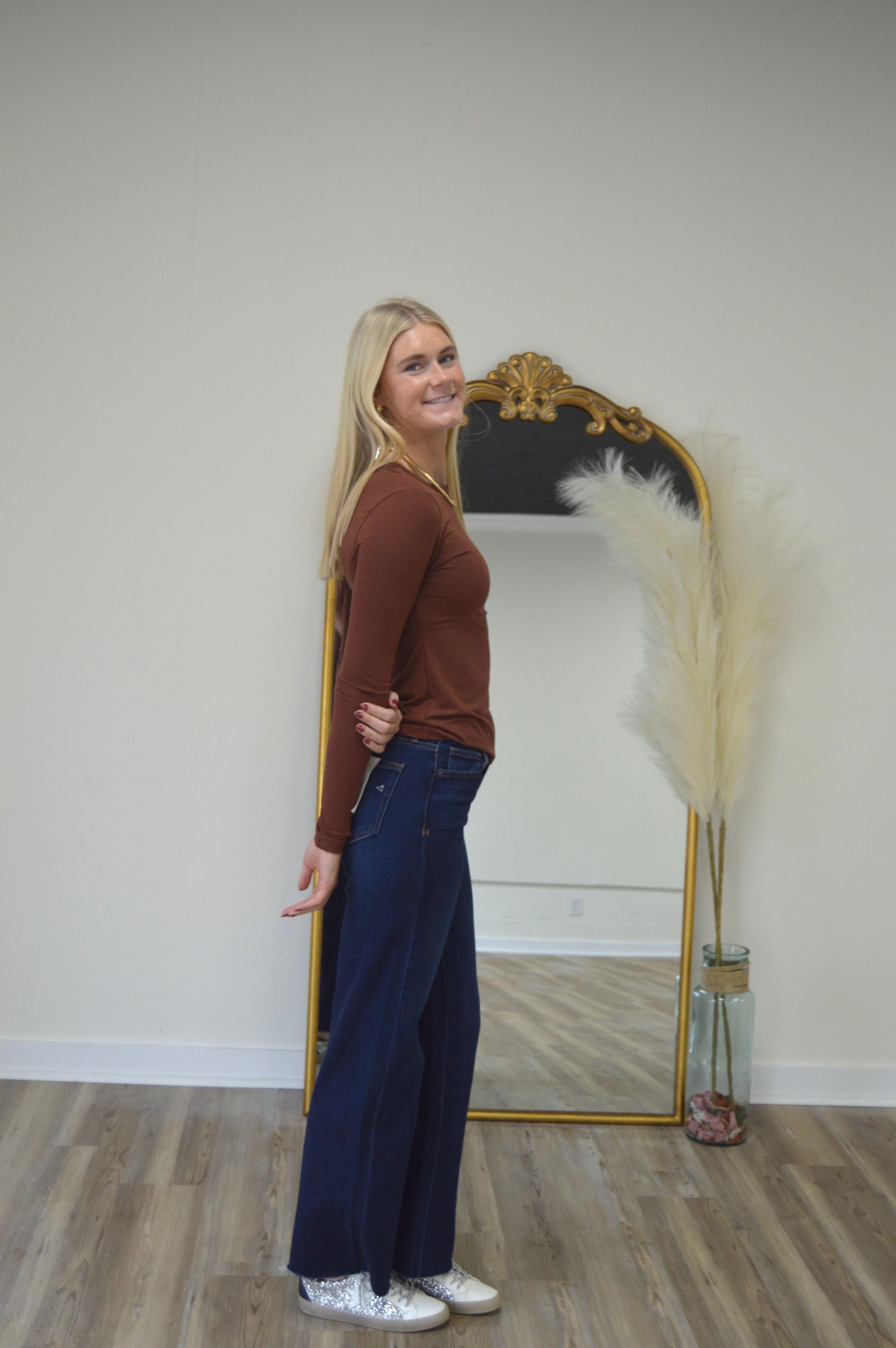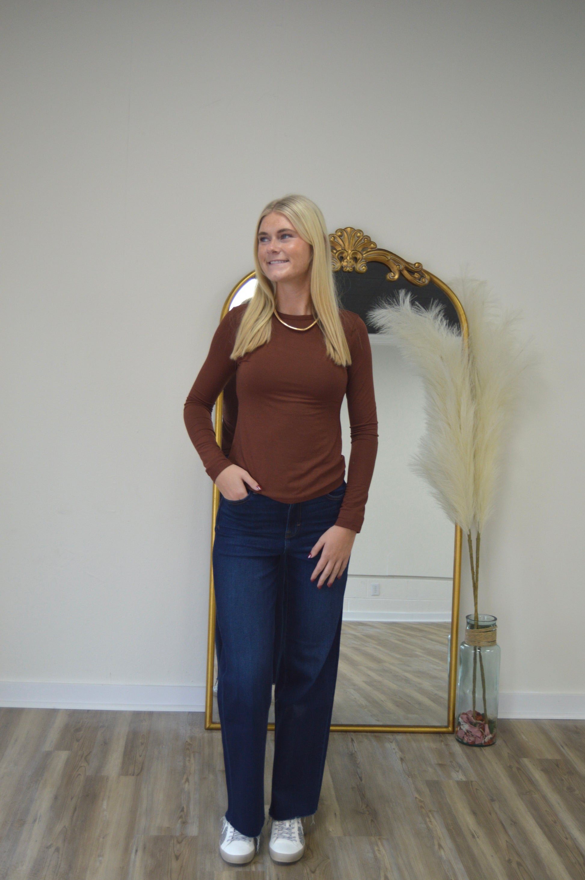 This long sleeve features a slim, body-skimming fit with generous stretch for comfort and flexibility. It styles beautifully on its own or as a base layer under jackets, cardigans, shackets, sweaters, and overalls. The flattering chestnut color offers a warm, elevated neutral that pairs effortlessly with denim, trousers, skirts, and athleisure. Not sheer, not bulky — just a perfect everyday essential that layers like a dream.