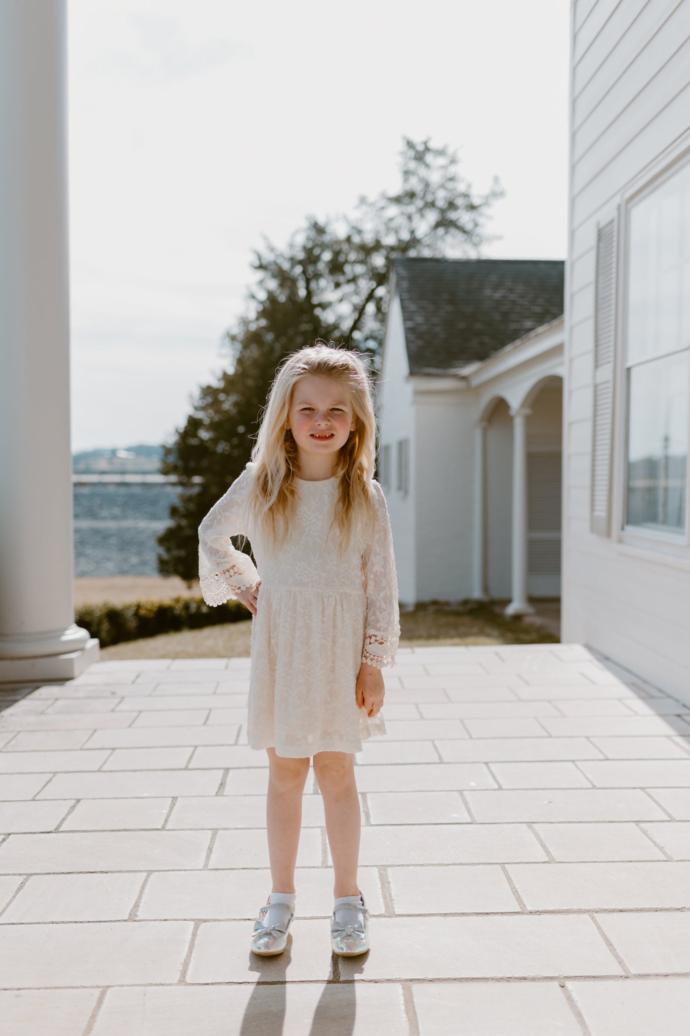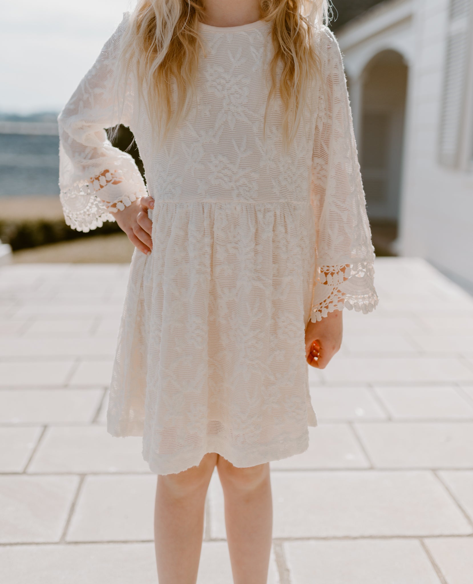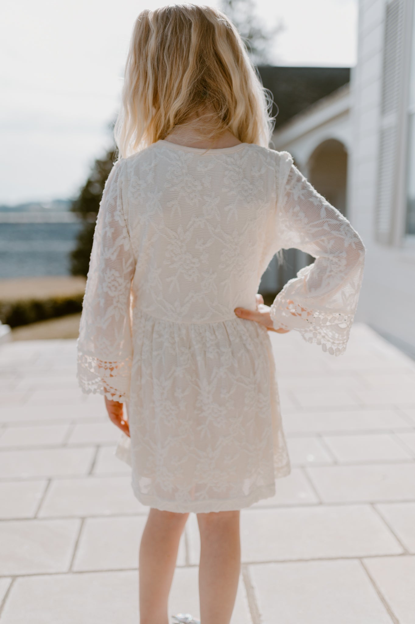 Mama's match your pretty girls of all ages in these elegant ivory lace dresses. Mommy's dress has a light beige slip fully wrapped in graceful lace, a tasteful "V" neckline, and a discreet side zipper. You will love the flared sleeves and stretchy elastic waist. Your little ladies can match your beautiful dress in the same stylish lace with trimmed flared sleeves. The infant onesie has a button closure. This set of matching dresses will be gorgeous for your next family photoshoot and coordinates beautifully with other color schemes.