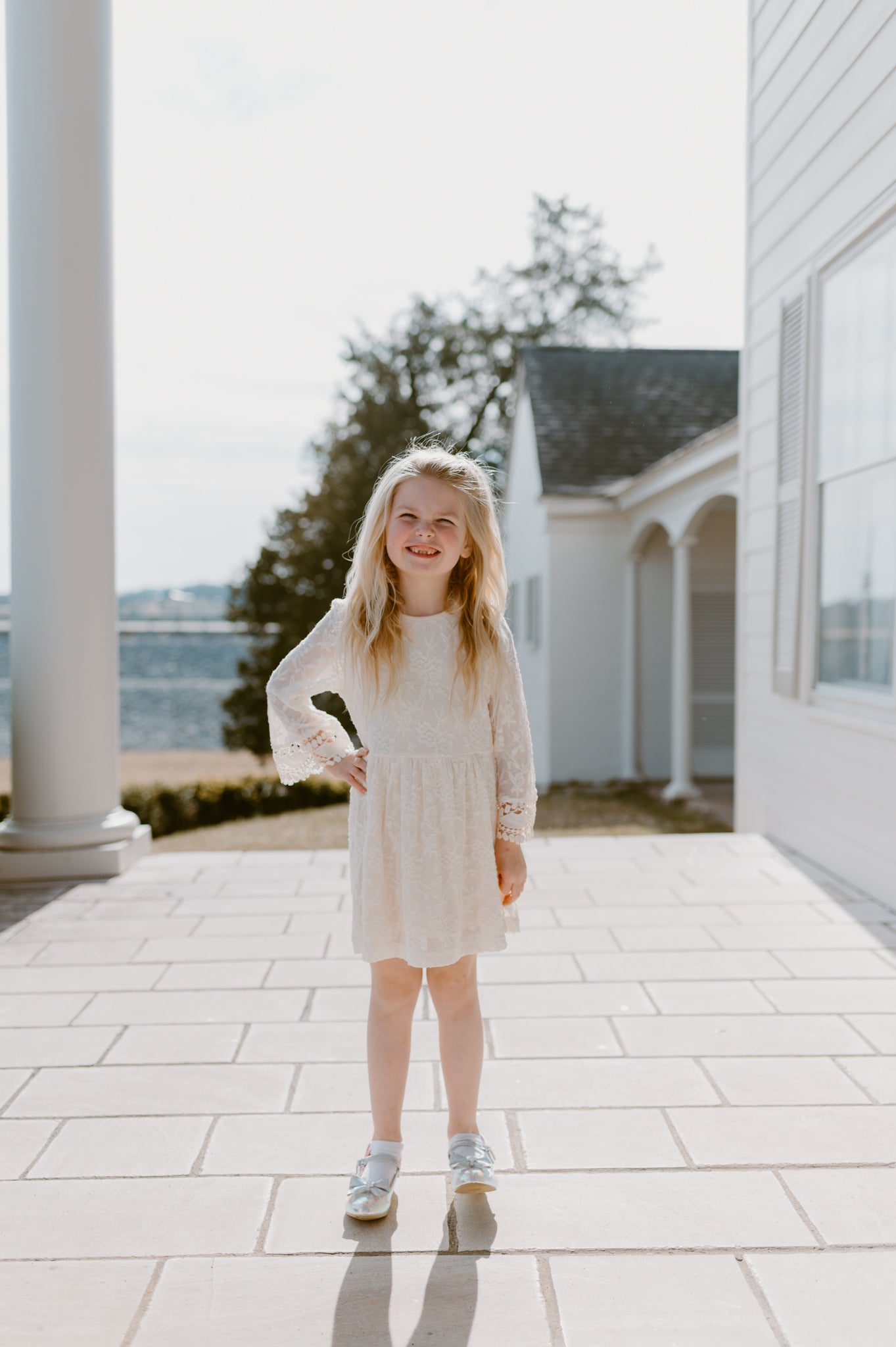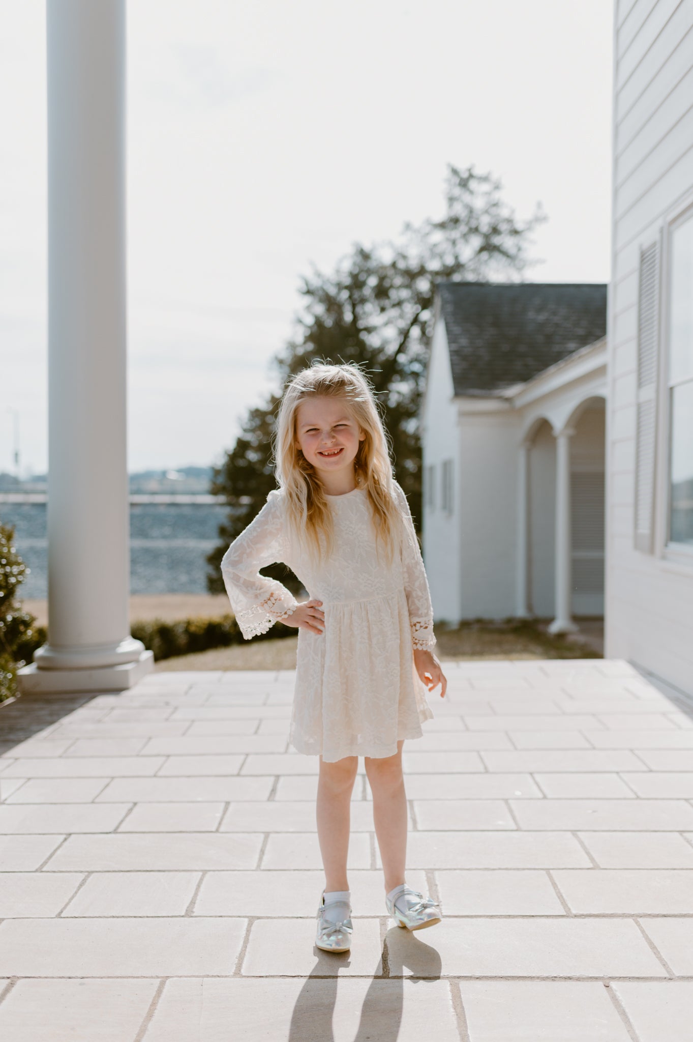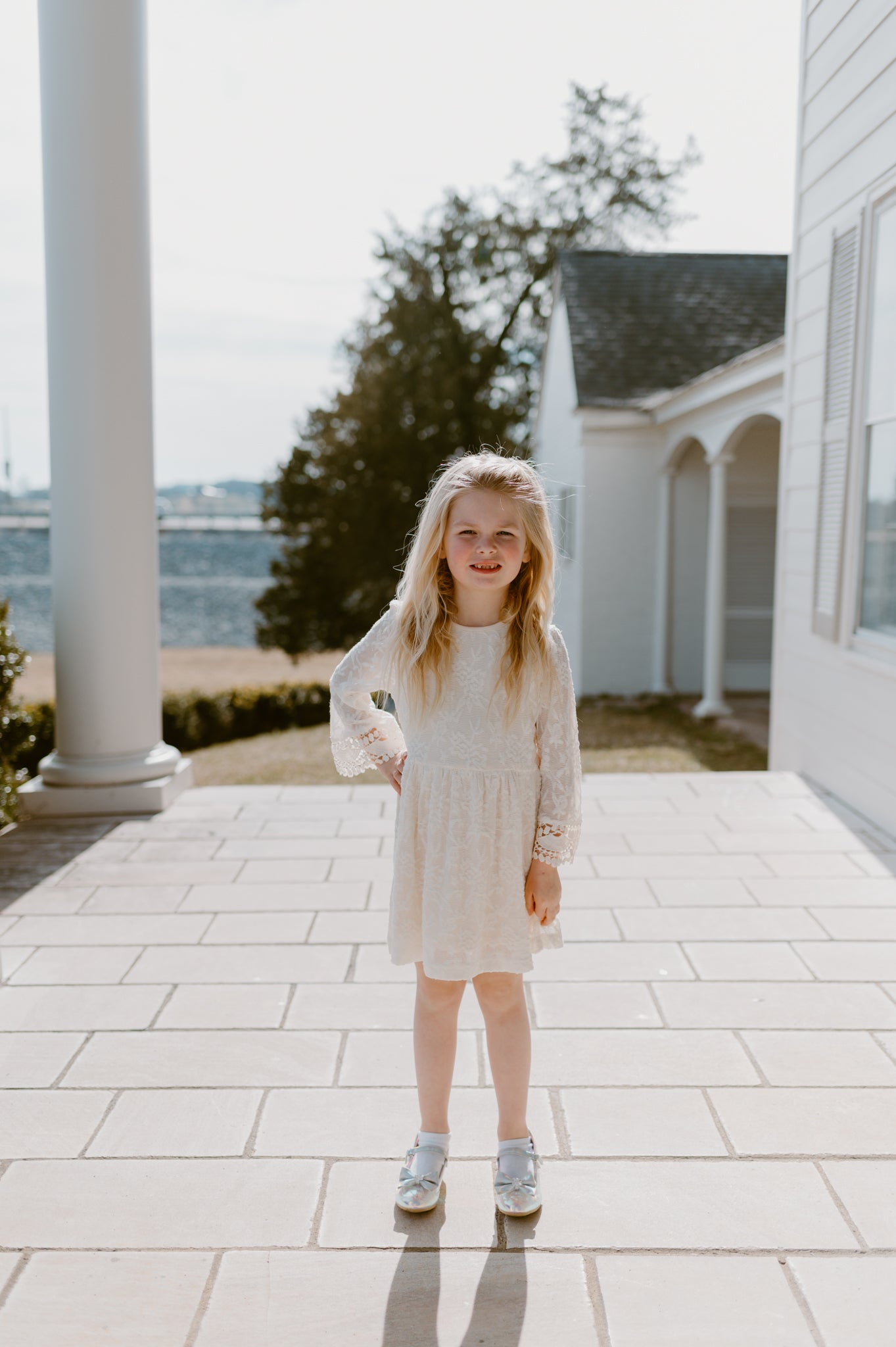 Mama's match your pretty girls of all ages in these elegant ivory lace dresses. Mommy's dress has a light beige slip fully wrapped in graceful lace, a tasteful "V" neckline, and a discreet side zipper. You will love the flared sleeves and stretchy elastic waist. Your little ladies can match your beautiful dress in the same stylish lace with trimmed flared sleeves. The infant onesie has a button closure. This set of matching dresses will be gorgeous for your next family photoshoot and coordinates beautifully with other color schemes.