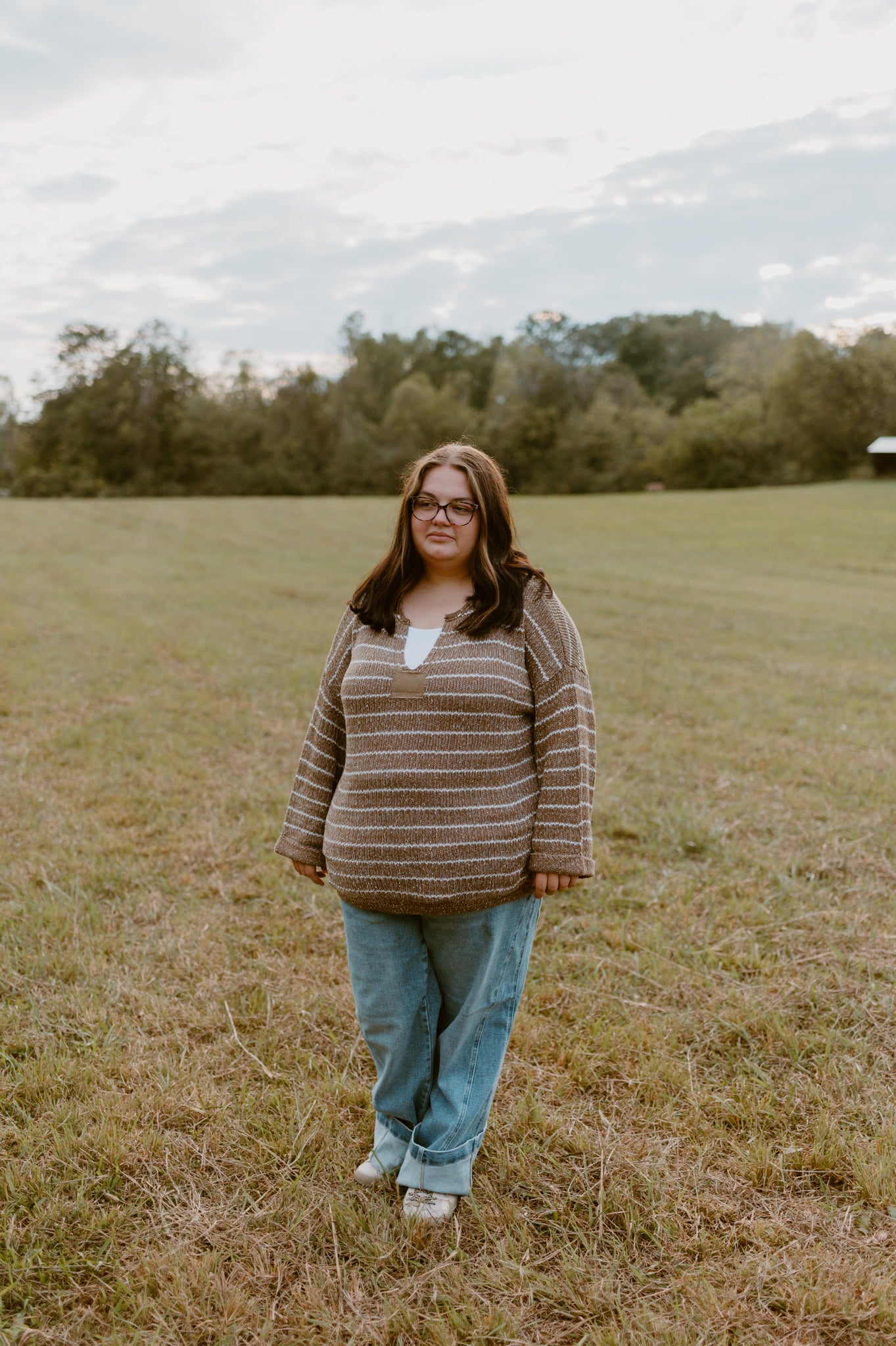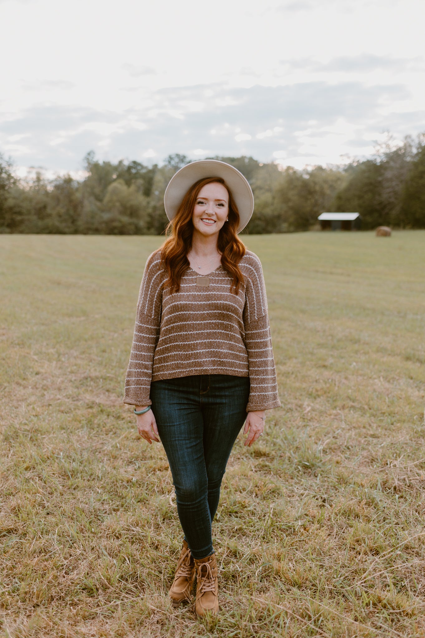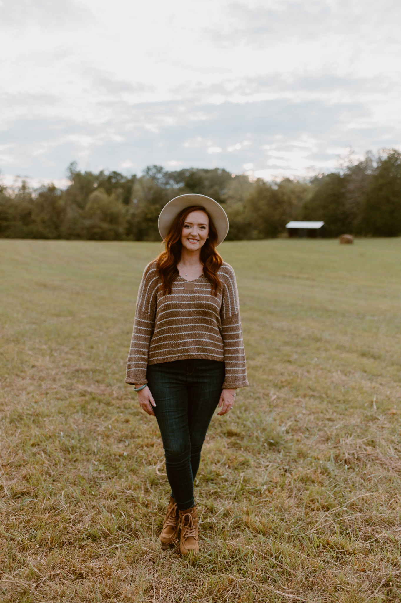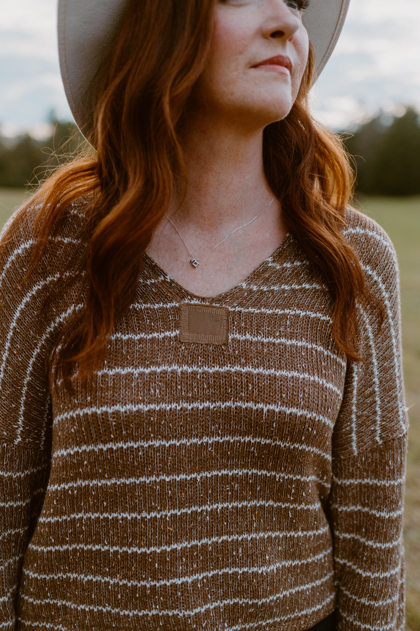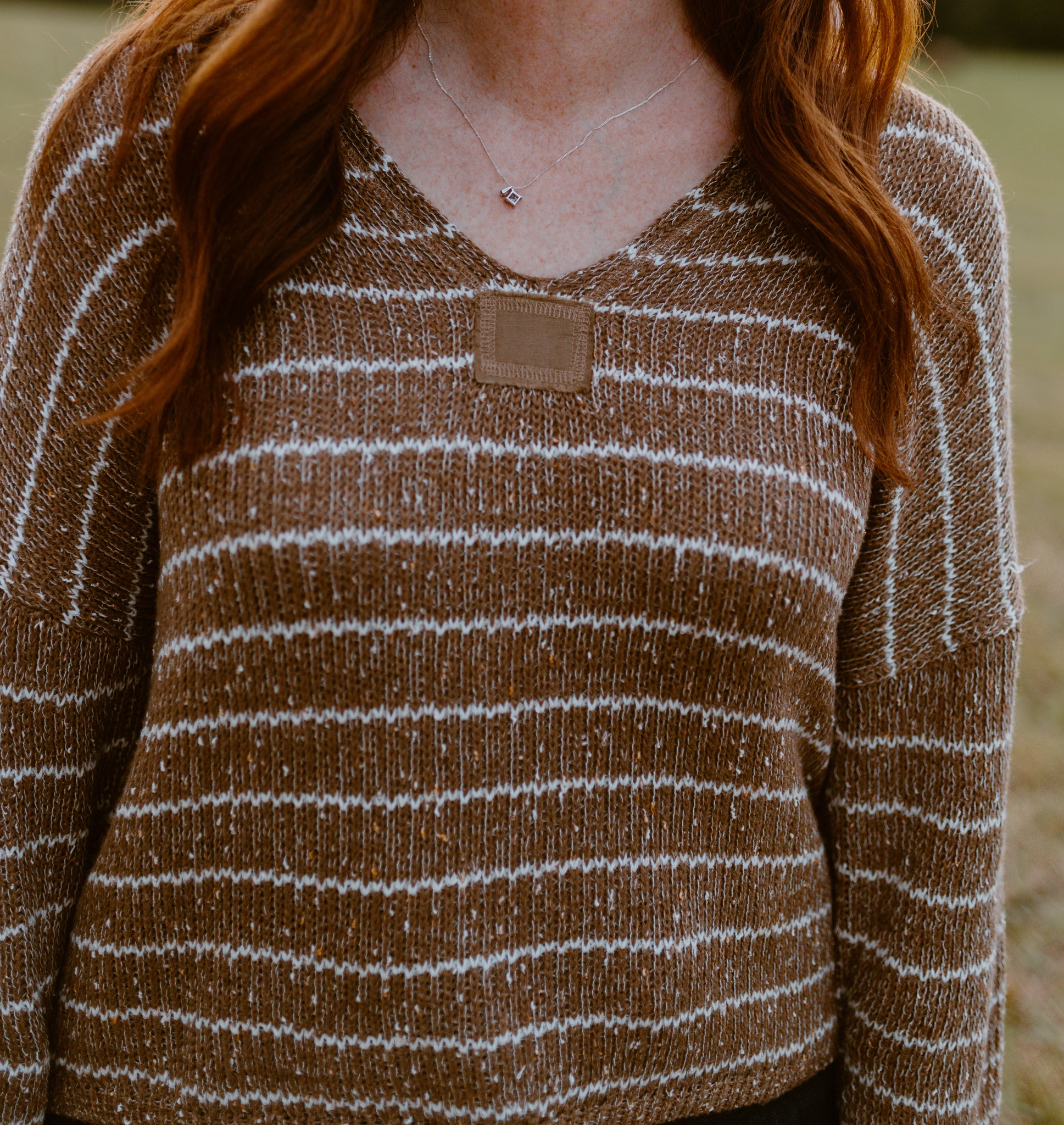 Stay comfortable and stylish in this drop shoulder Mocha Striped Knit Sweater that features a v-neck design and a unique stripe pattern.