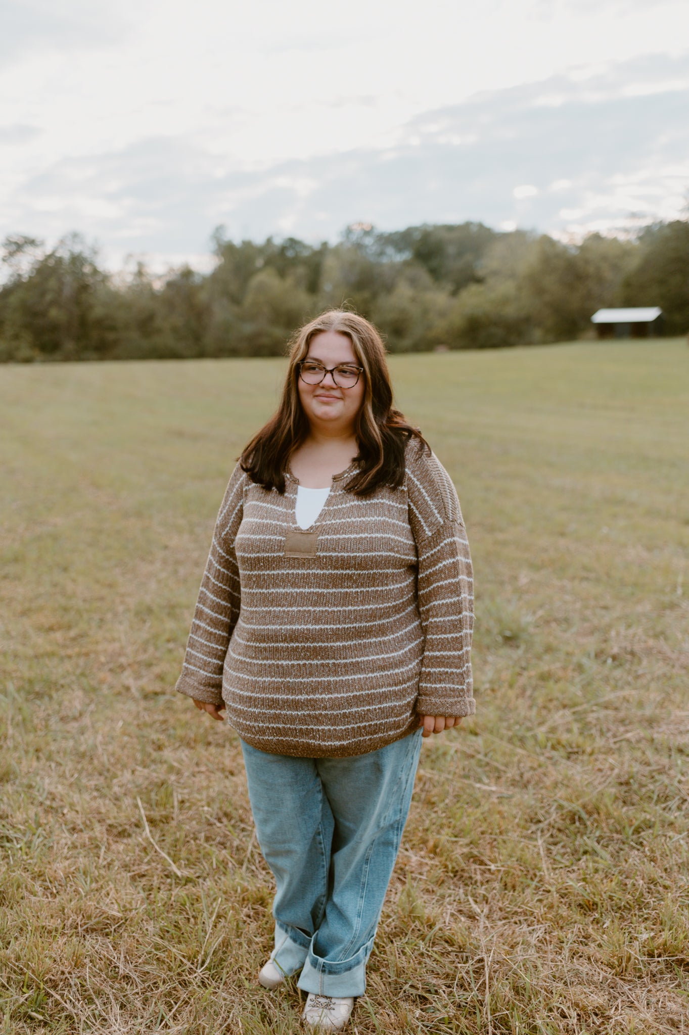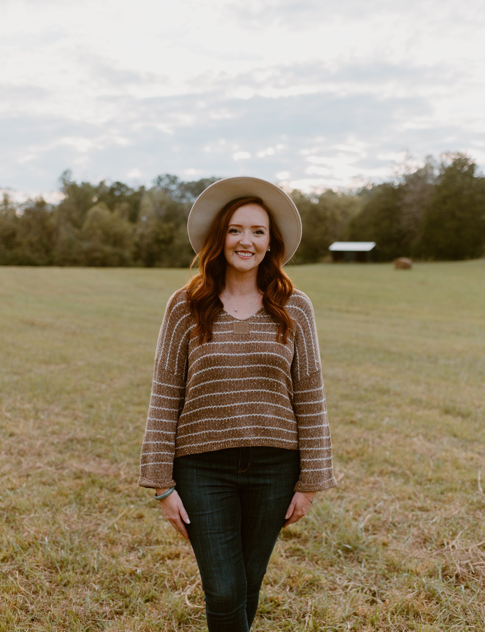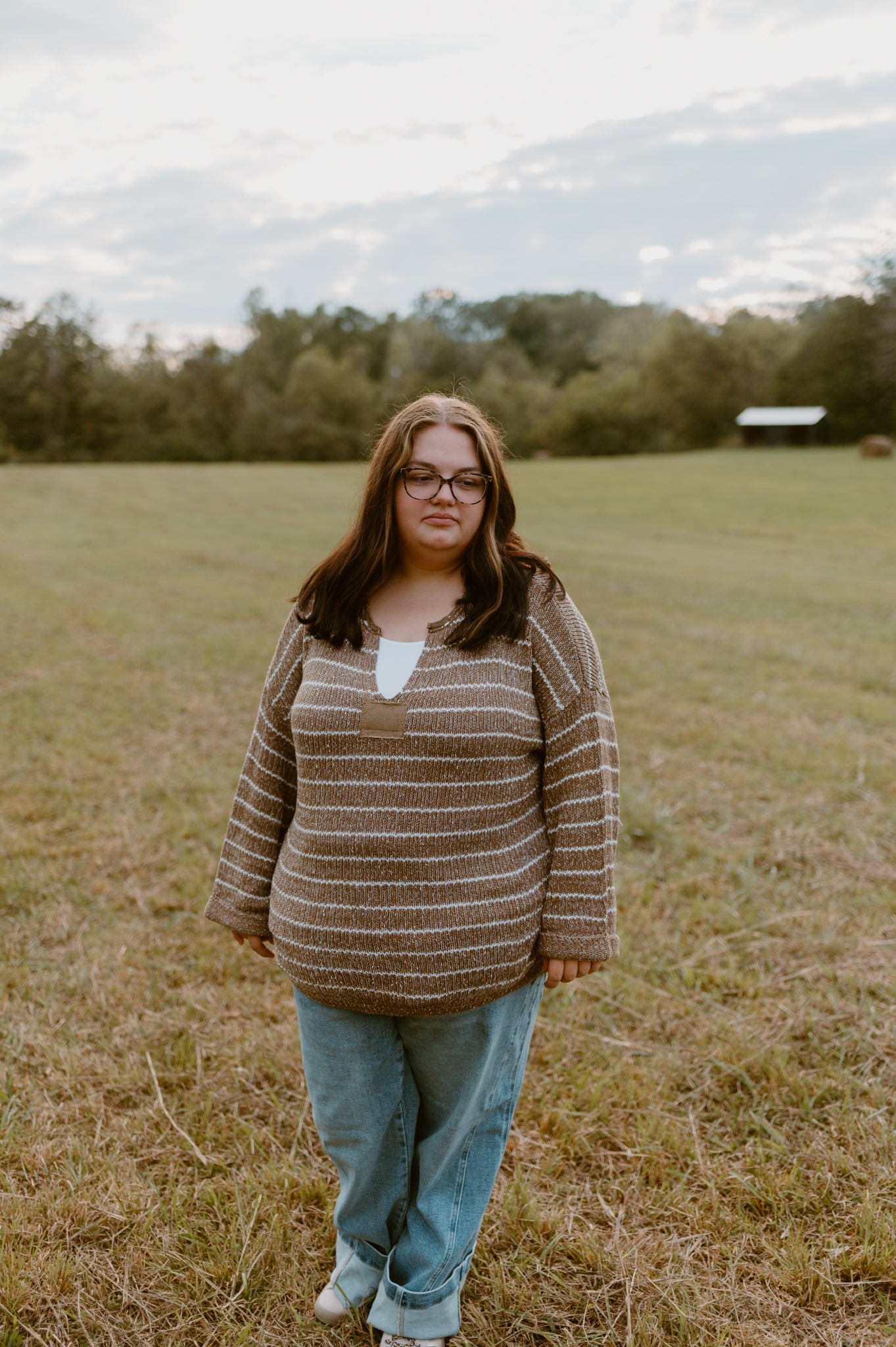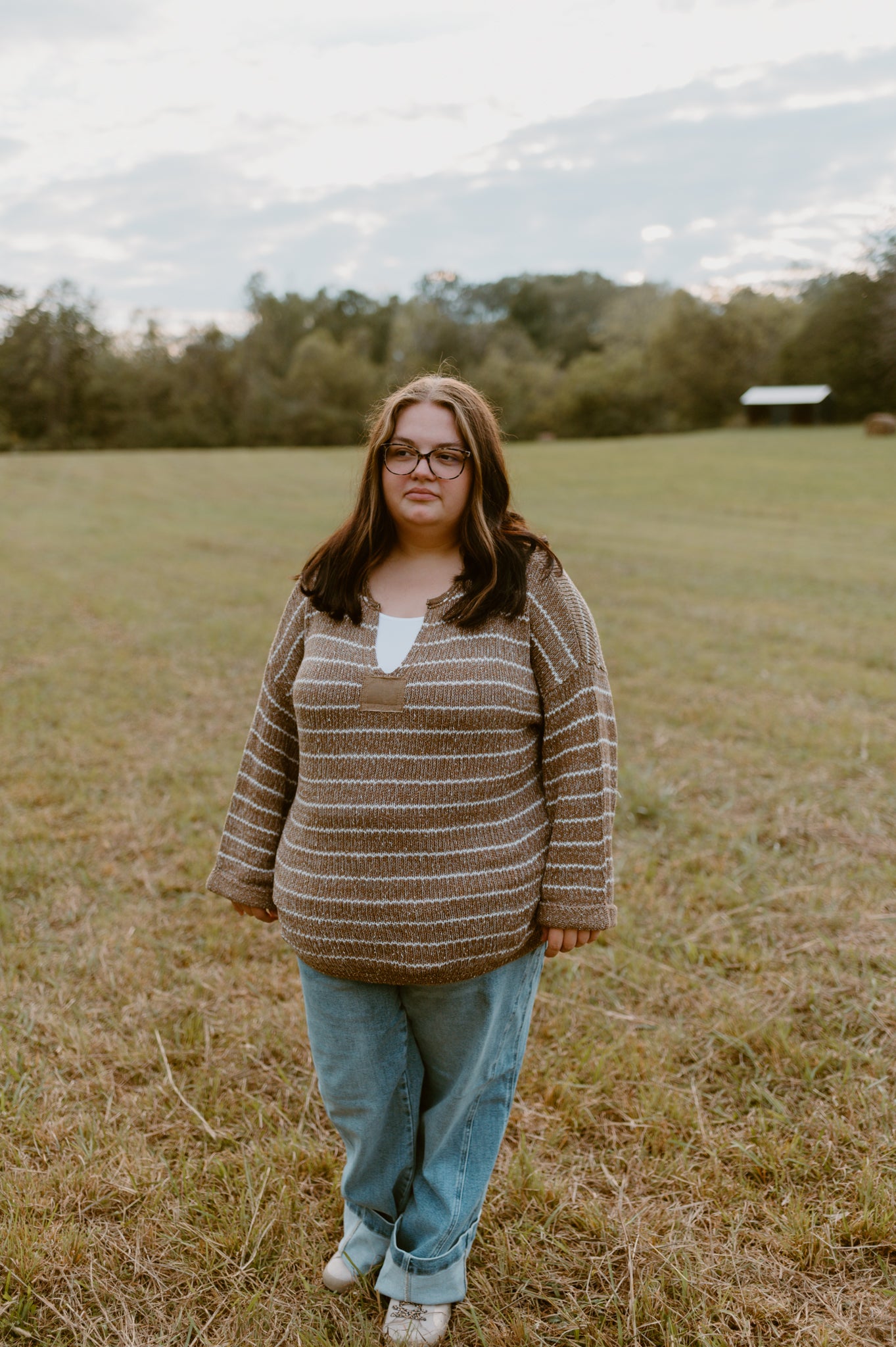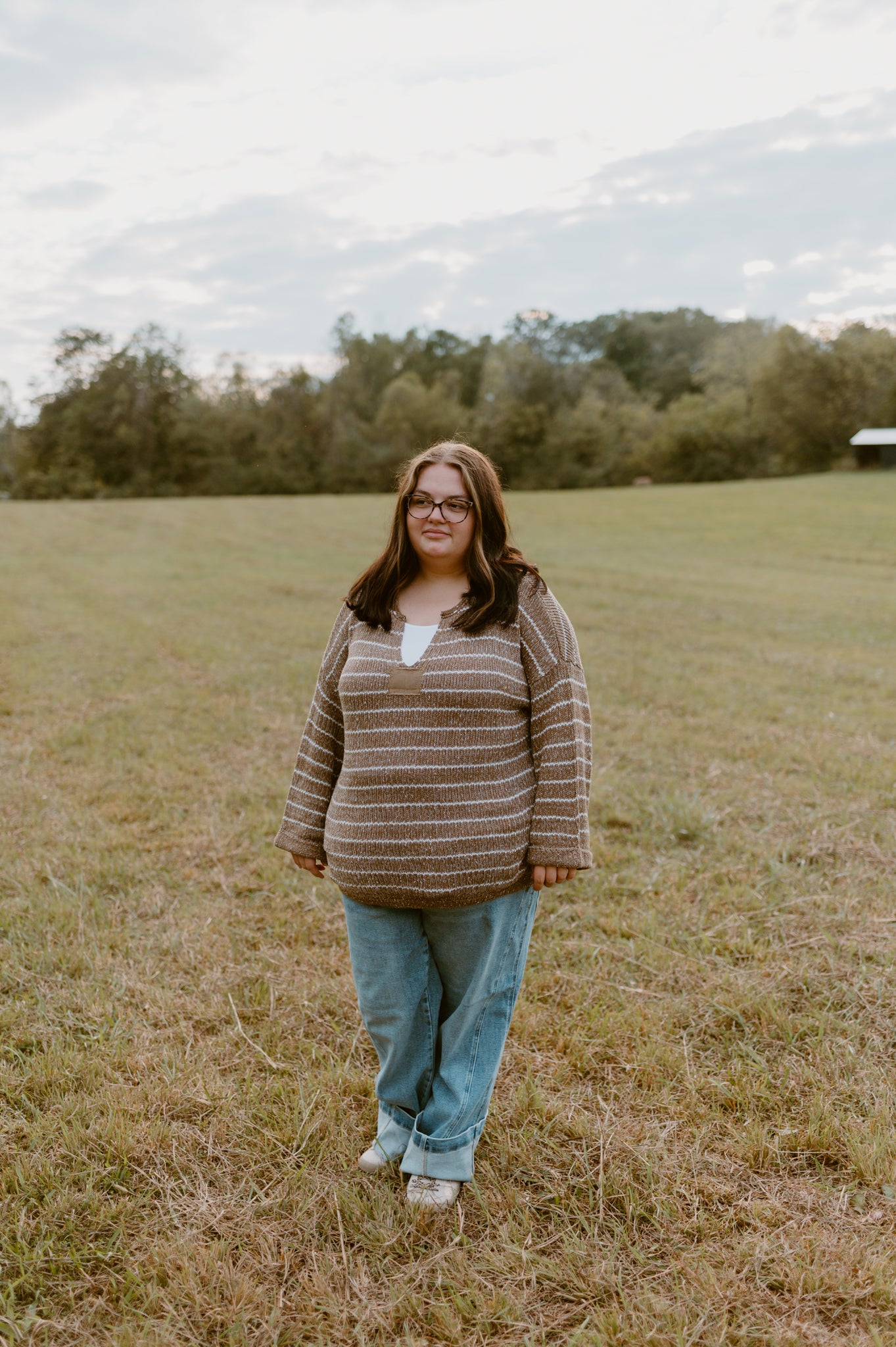 Stay comfortable and stylish in this drop shoulder Mocha Striped Knit Sweater that features a v-neck design and a unique stripe pattern.