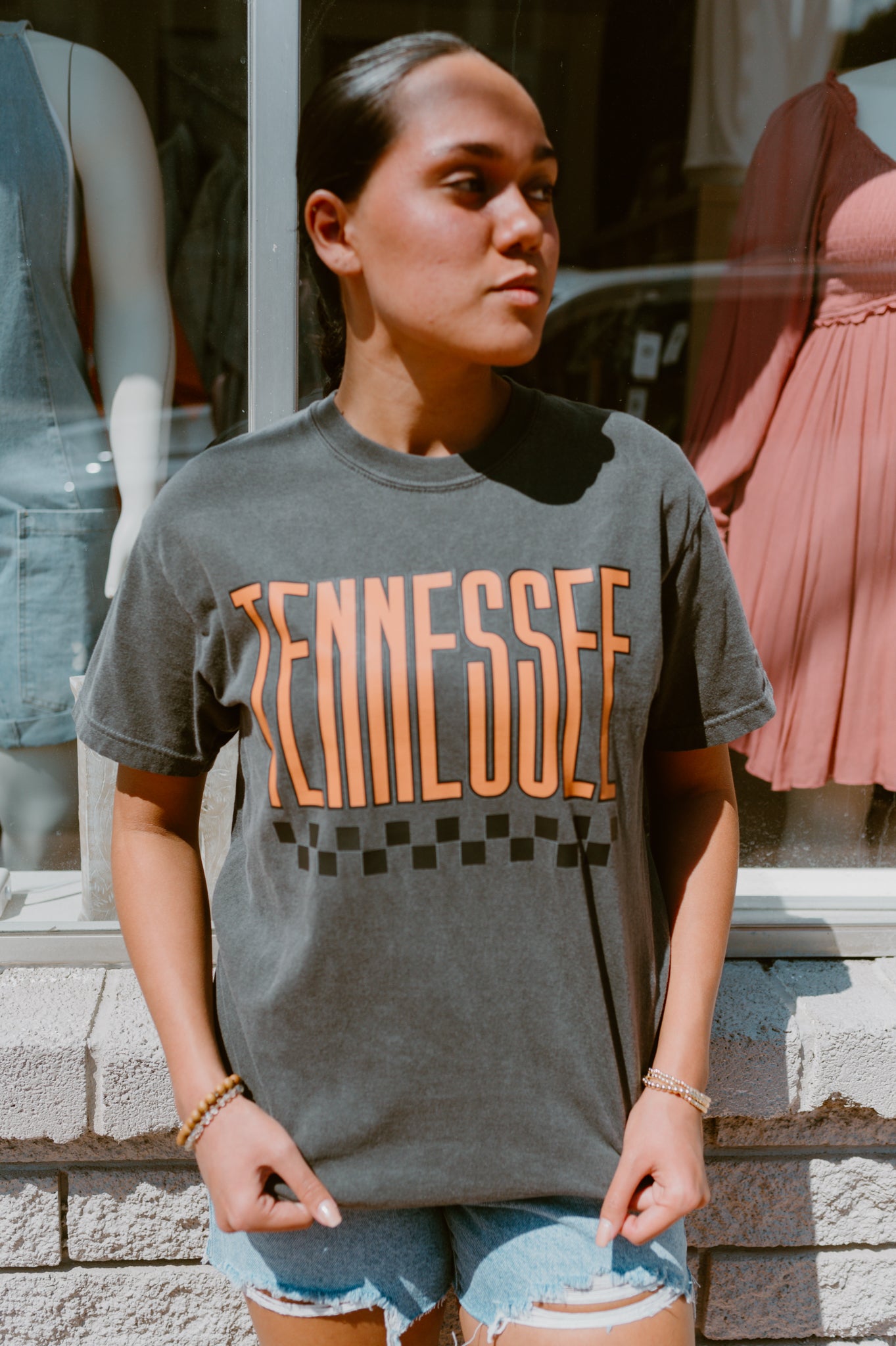 Get ready to blast your way through game day with the Retro Tennessee Checkerboard Graphic Tee! With an eye-catching black and pepper gray checkerboard and orange Tennessee graphic on a pepper gray comfort colors tee, this bestseller will make you stand out and show your team spirit. Don't miss out, grab yours now!