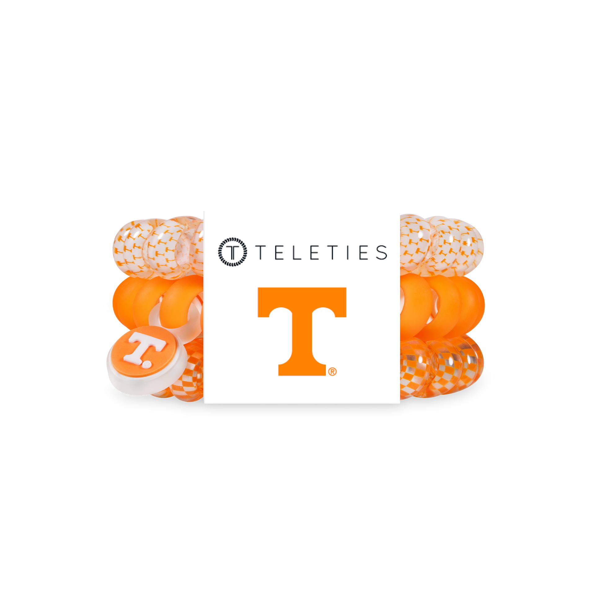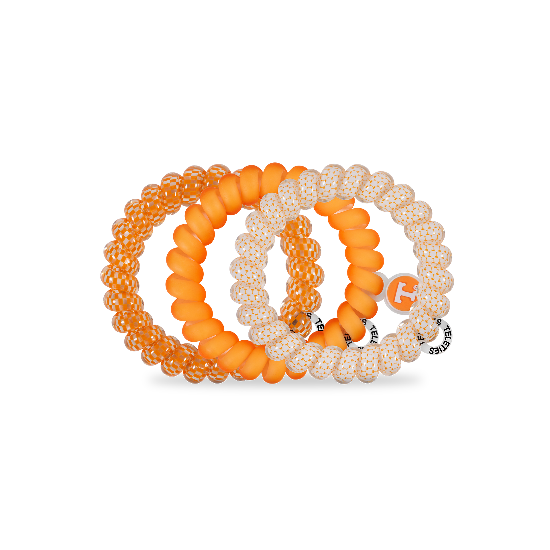 Cheer on the University of Tennessee in style with the TELETIES, Go Vols! Large Hair Ties in White and Orange offer a strong grip without damage, doubling as a chic wrist accessory when not in use. Your new favorite hair essentials all year round. Shop your favorite University of Tennessee hair accessories now! Go Vols!