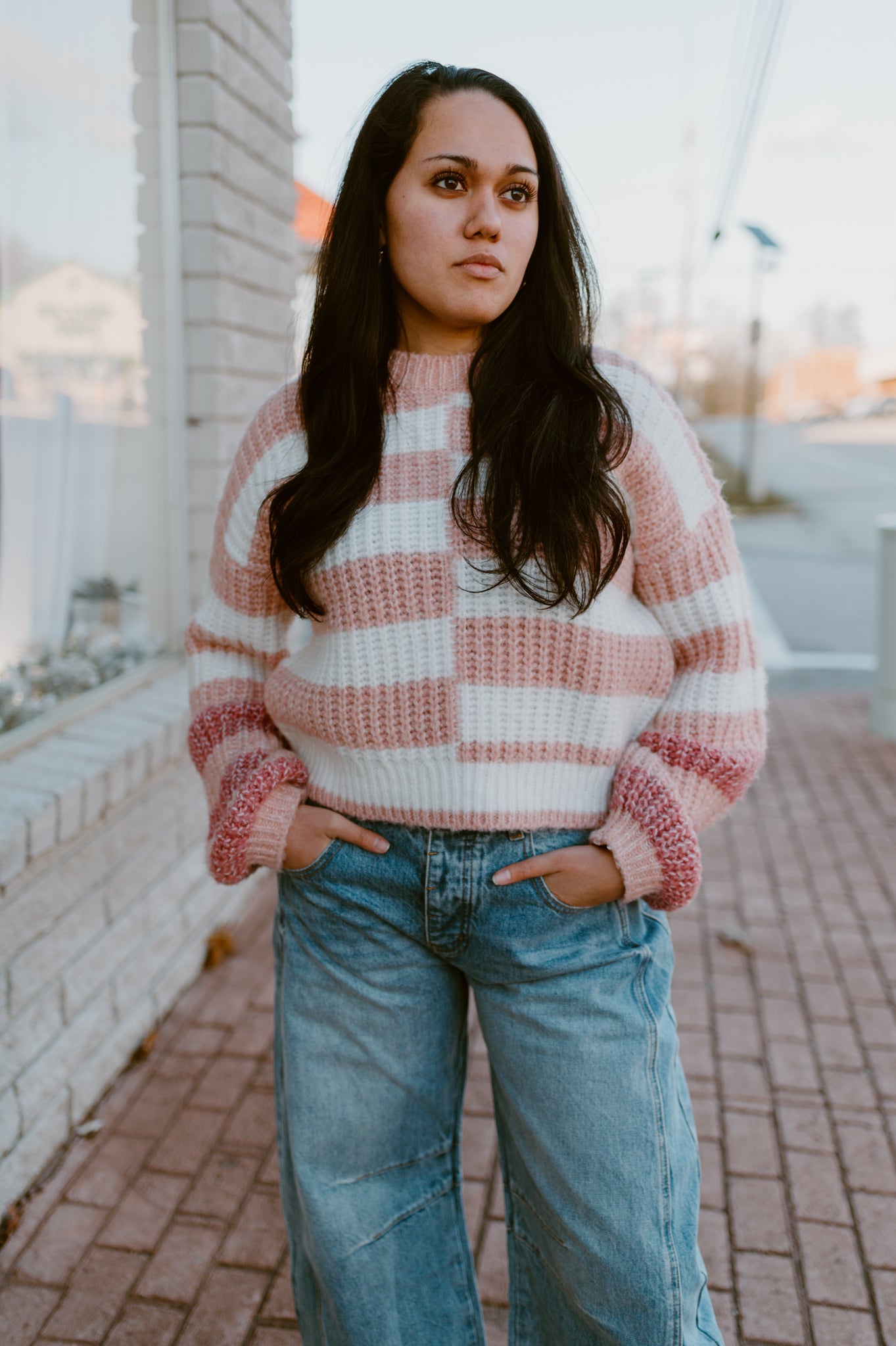 A perfectly cozy statement piece that brings together comfort and style. This chunky knit sweater features bold horizontal stripes in soft pink and cream, creating a sweet yet eye-catching look. The cropped length hits just at the waist, making it ideal for pairing with your favorite high-waisted denim or skirts.