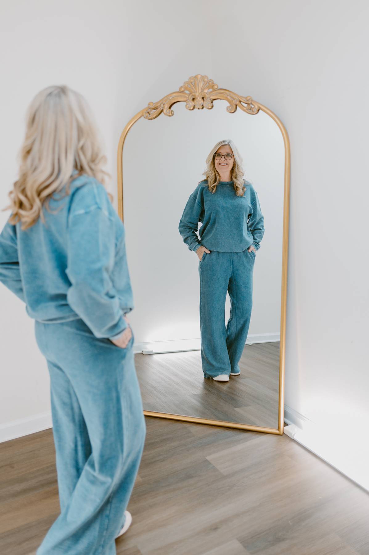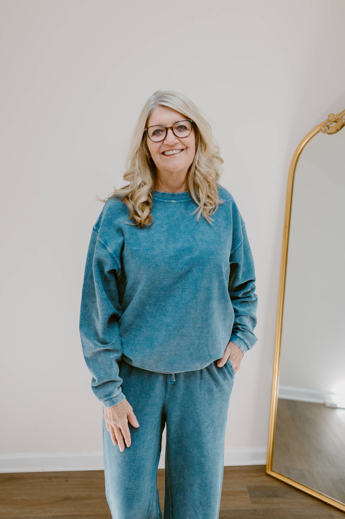 Your new go-to layer, the Essential Luxe Corded Crew is the definition of effortless comfort with a polished edge. Crafted in our signature corded fabric, this oversized crew brings that soft, structured texture you love while offering a premium, vintage-inspired finish. In Navy, it’s as timeless as it is versatile — easy to style from weekday errands to weekend lounging.