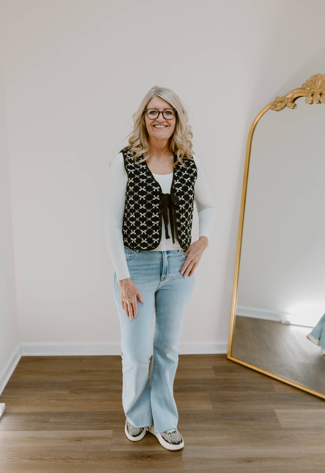 This vest isn’t just a throw-on accessory—it’s an outfit maker. With its quilt-inspired texture and sweet bow motif, it blends vintage charm with modern boutique style. Think of it as the piece that pulls your whole look together, whether you’re styling it with denim, skirts, or flowy dresses.