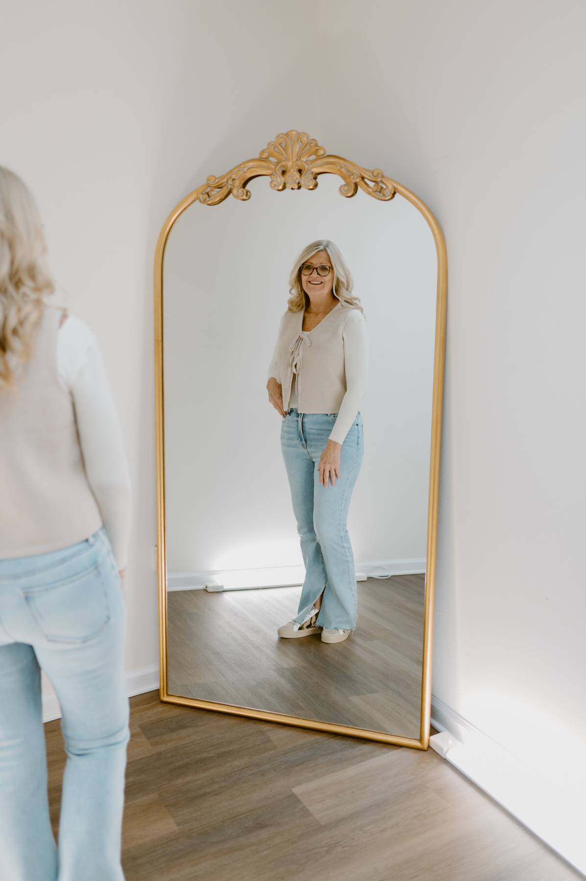 - Style with high-rise jeans and ankle boots for a modern, put-together everyday outfit.