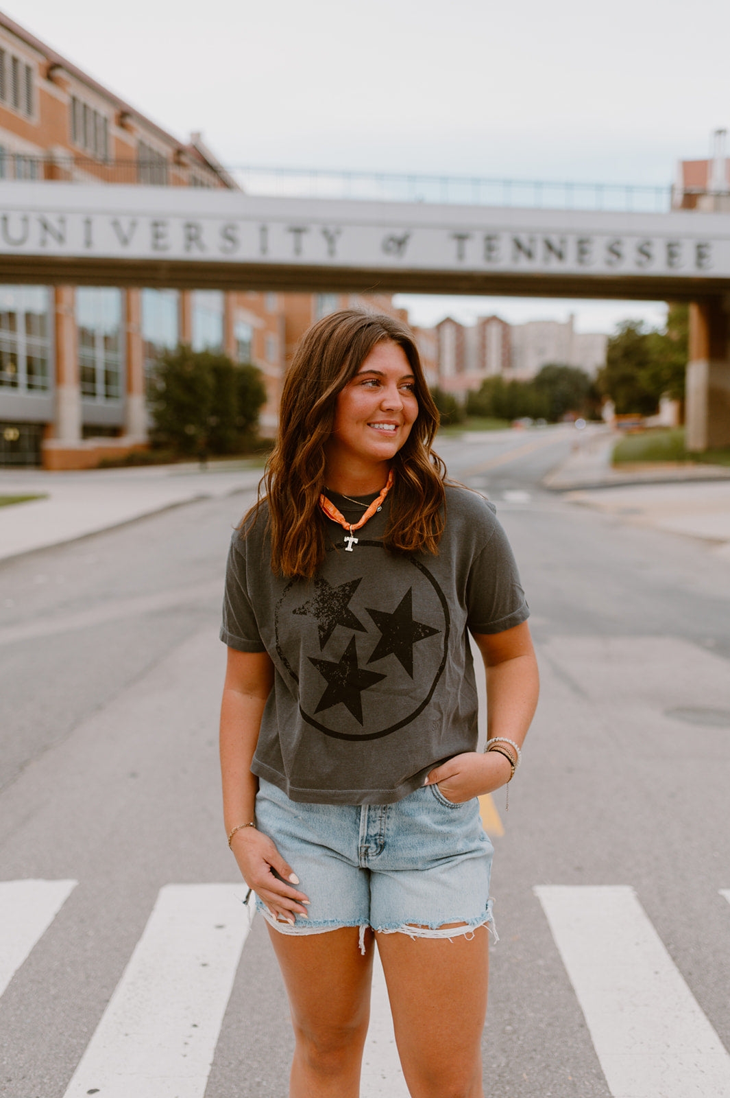Rep Tennessee pride in effortless style with our Tristar Pepper Crop Tee. Featuring the iconic Tristar design in a bold, vintage-inspired black print, this washed pepper tee is the perfect mix of sporty and chic. Its cropped fit and relaxed silhouette make it an easy go-to for game days, casual outings, or layering with your favorite jacket.